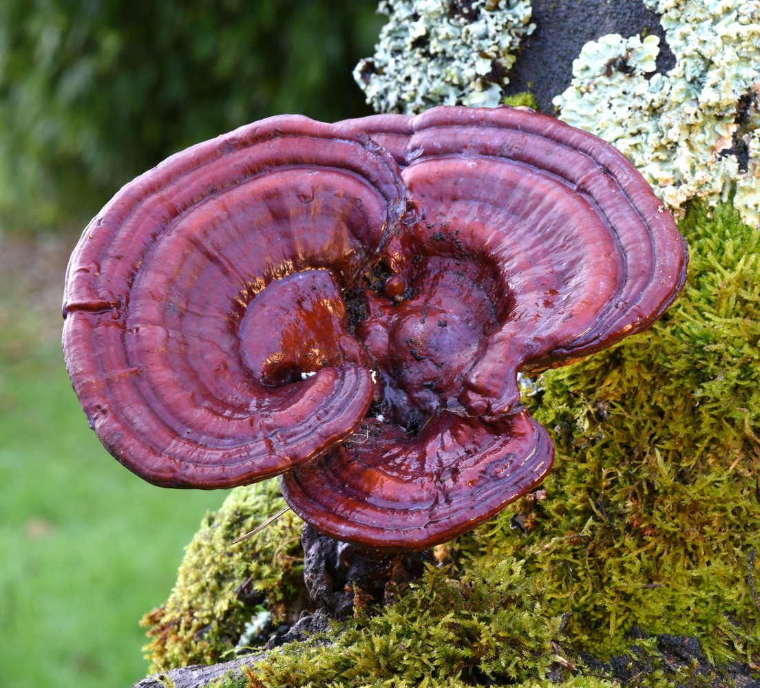El reishi es un hongo que desempeña un papel crucial en los ecosistemas forestales gracias a su micelio, que descompone materia orgánica, recicla nutrientes y promueve la biodiversidad. Se distingue por sus cuerpos fructíferos lacados de color óxido con estrías onduladas y una base porosa y pálida.