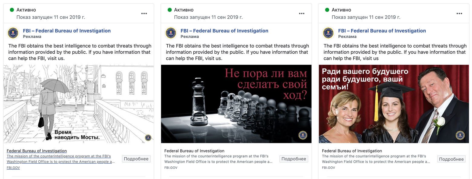 En la sección 'Biblioteca de publicidad' de Facebook, donde se puede realizar un seguimiento de las campañas publicitarias en la red social, se indica que los tres anuncios en ruso fueron lanzados por el FBI el 11 de septiembre de 2019 y todavía están activos. Al mismo tiempo, una fuente de la CNN afirma que estos avisos aparecieron por primera vez en el verano.