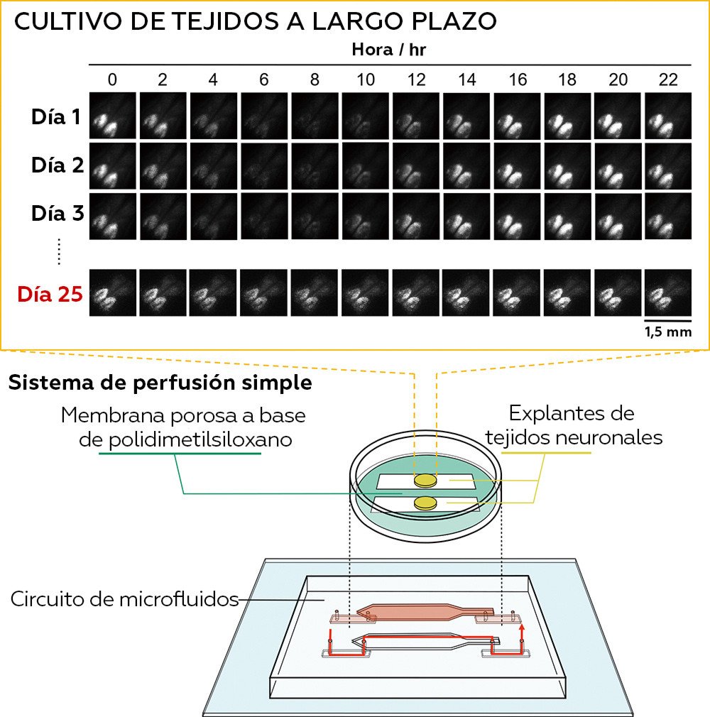 Para hacer factible el experimento, los científicos desarrollaron una plataforma de perfusión "microfluídica" con un material polímero que a menudo se usa como antiespumante en medicamentos, detalla un artículo publicado en la revista Analytical Sciences este 10 de octubre. El tejido neuronal se sujetó en ese dispositivo sobre una membrana porosa y se mantuvo en constante humedad, aunque sin rociarle líquido directamente.