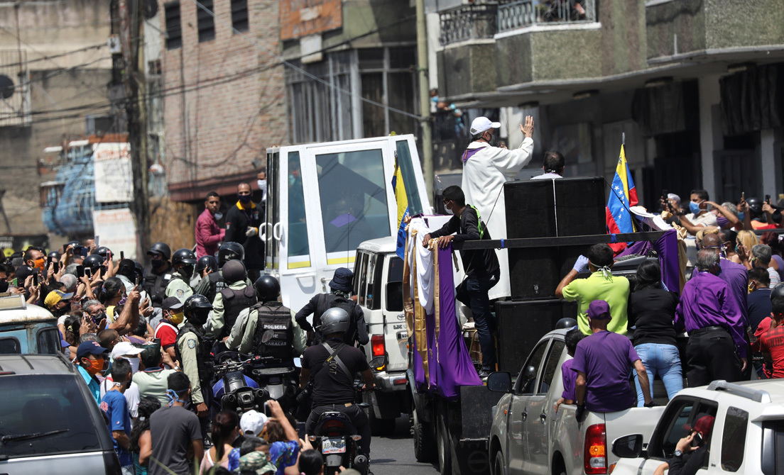 En Caracas, Venezuela, este miércoles 8 de abril hicieron un recorrido de la imagen del Nazareno por las calles, custodiada por efectivos de la Guardia Nacional Bolivariana, una actividad que ya había sido adelantada la semana pasada por la Iglesia Católica local.