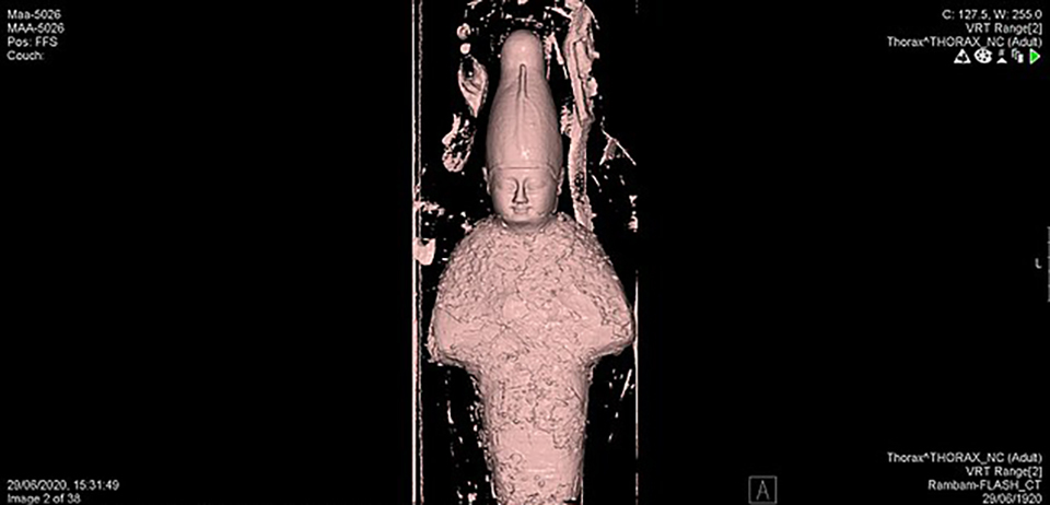 Especialistas de un hospital israelí descubrieron que una momia conservada en el Museo Nacional Marítimo de Haifa era en realidad una figura artificial hecha de barro y grano. El hallazgo fue posible tras someter a la supuesta momia a una tomografía computerizada.