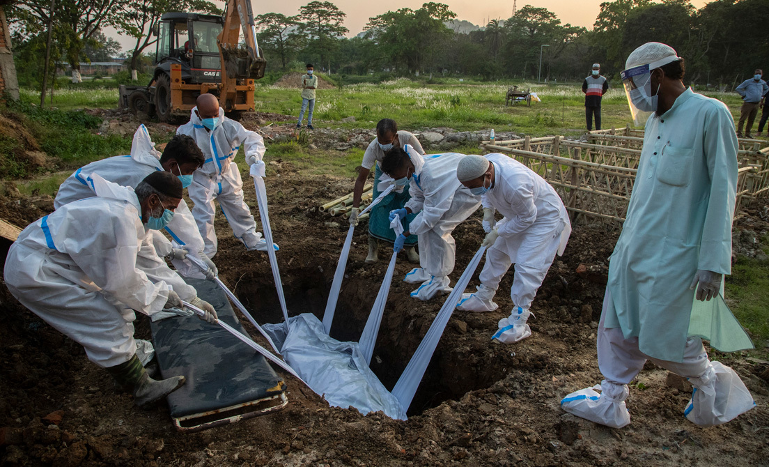 En otras fotos, hombres con equipo de protección cavan tumbas antes de enterrar los cuerpos en la ciudad de Gauhati, en el estado de Assam.