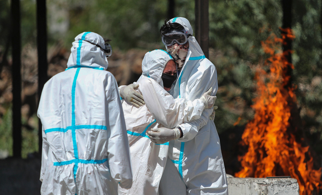 El impacto emocional de la lucha contra el coronavirus se aprecia en fotografías de familiares vestidos con equipo de protección completo que lloran y se consuelan entre sí ante la pérdida de sus seres queridos.
