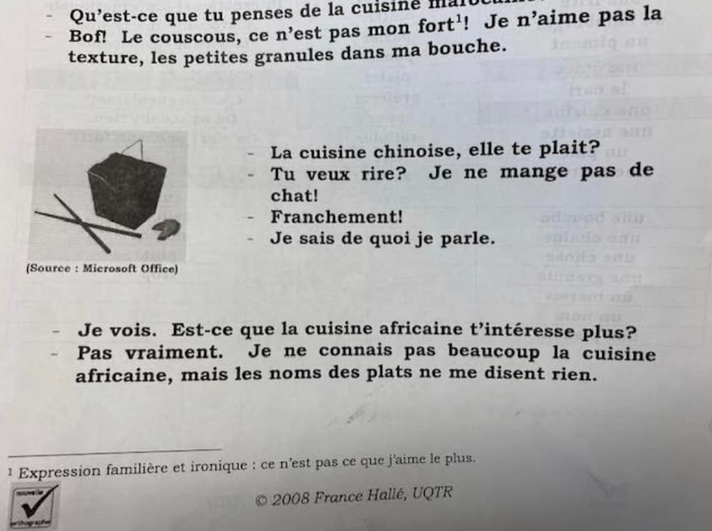 Otra de las hojas de trabajo empleadas presenta un diálogo en el que una persona le pregunta a otra si le gusta la comida china, a lo que esta responde: "¿Estás bromeando? No como gatos", argumentando que sabe de lo que habla.