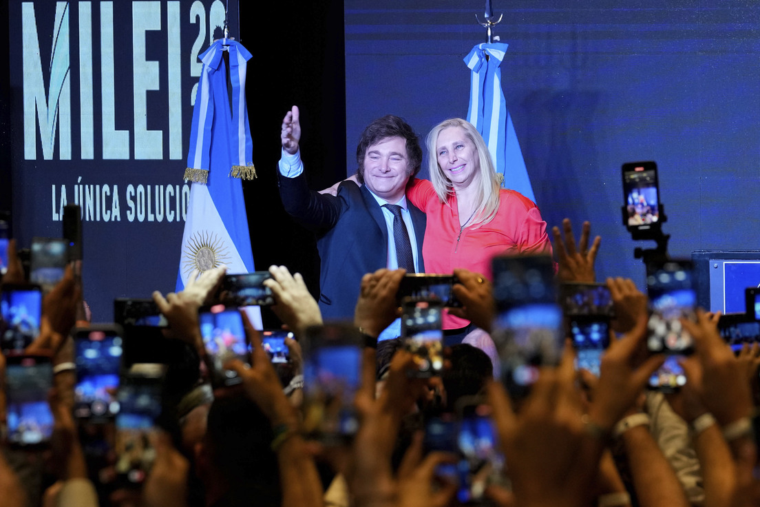 El futuro gobernante de Argentina se presentó ante sus seguidores junto a su hermana y asesora de campaña, Karina Milei, la vicepresidenta electa Victoria Villarruel, cuestionada por su postura negacionista de los crímenes cometidos por la última dictadura, entre otros referentes del espacio.