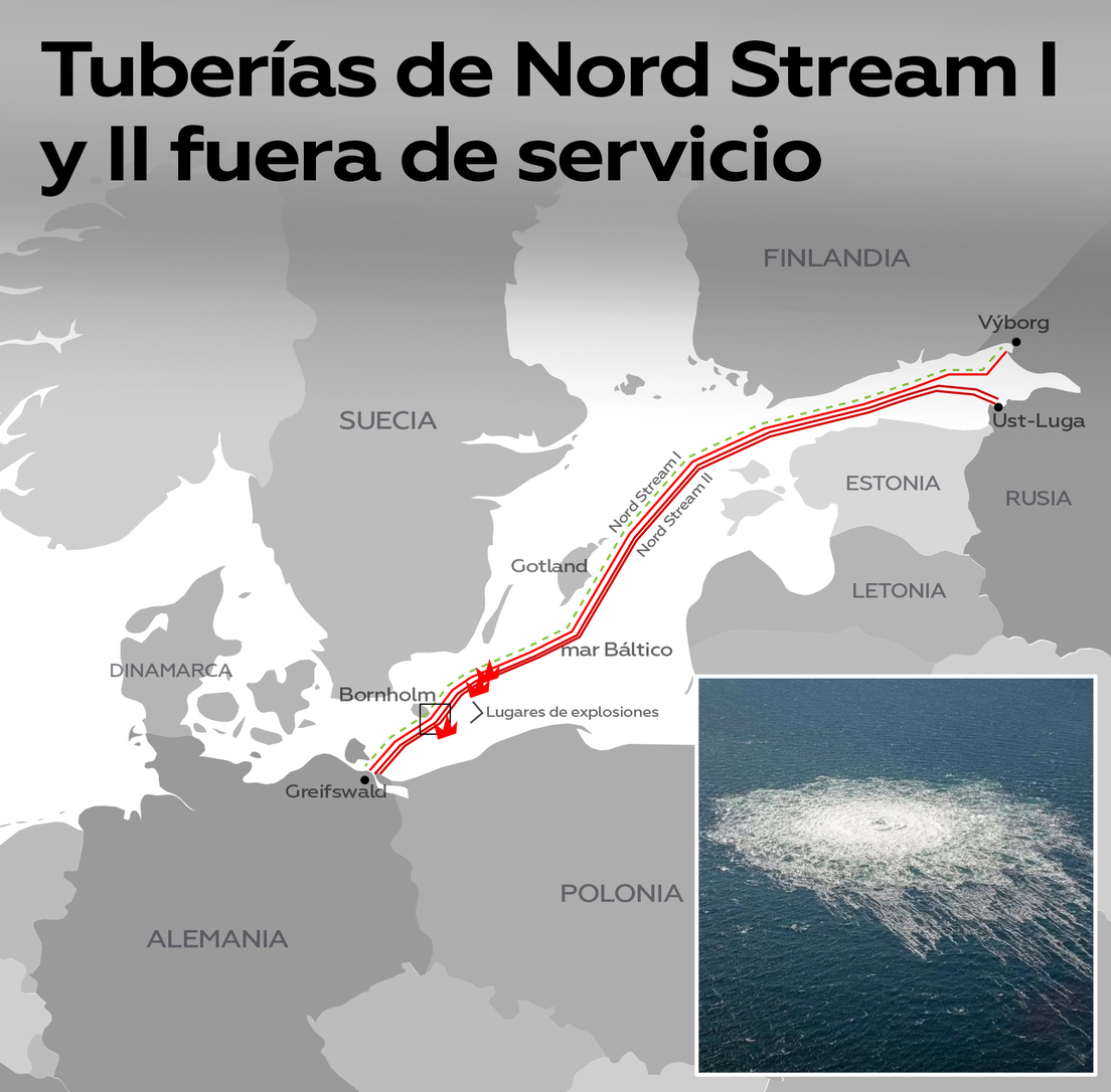 - El sabotaje de los gasoductos Nord Stream 1 y 2 tuvo lugar en el fondo del mar Báltico en las zonas económicas exclusivas de Dinamarca y Suecia, cerca de la isla Bornholm, el 26 de septiembre de 2022. El carácter premeditado de las explosiones se confirmó durante los exámenes posteriores. Una de las bombas dejadas por los perpetradores junto a las tuberías se quedó sin detonar.